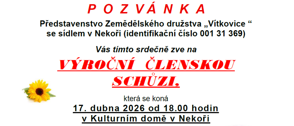Představenstvo Zemědělského družstva „Vítkovice “se sídlem v Nekoři (identifikační číslo 001 31 369) Vás tímto srdečně zve na VÝROČNÍ ČLENSKOU SCHŮZI, která se koná 17. dubna 2026 od 18.00 hodin ...