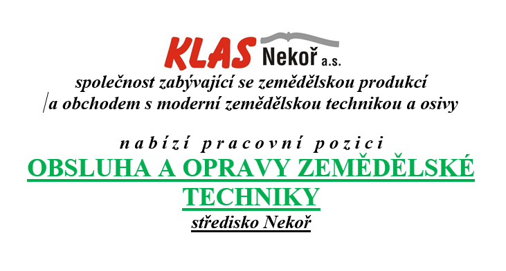 KLAS Nekoř a.s. – autorizovaný prodejce zemědělské techniky CLAAS, VÄDERSTAD, KVERNELAND, ANNABURGER, KRAMPE, DeLaval, prodejce olejů SHELL a osiv PIONEER včetně vlastní zemědělské výroby.