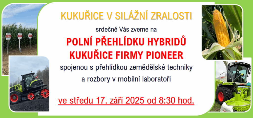 Zveme Vás na polní přehlídku hybridů kukuřice firmy Pioneer přineste si i rostliny kukuřic, zdarma Vám poskytneme rozbory silážní zralosti v mobilní laboratoři Pioneer KDY: středa, 17. září od 8:30 hod. ...