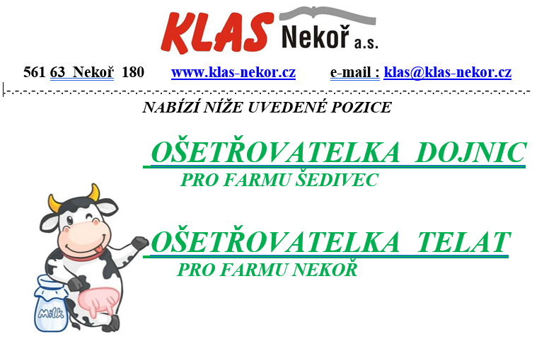 OŠETŘOVATELKA  DOJNIC PRO FARMU ŠEDIVEC Požadujeme: Náplň práce ošetřovatelky, ošetřovatele: OŠETŘOVATELKA  TELAT PRO FARMU NEKOŘ Požadujeme: Náplň práce ošetřovatelky, ošetřovatele telat: NABÍZÍME:    Nástup možný ihned. Zájemci přihlaste se na: ...
