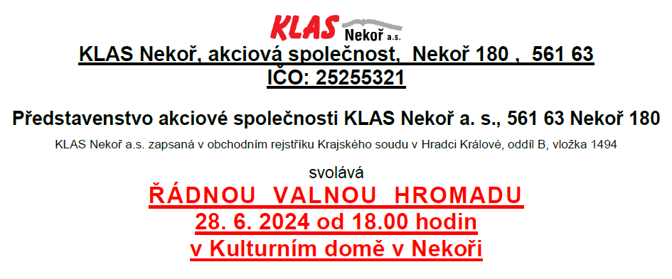 Představenstvo akciové společnosti KLAS Nekoř a. s., 561 63 Nekoř 180 KLAS Nekoř a.s. zapsaná v obchodním rejstříku Krajského soudu v Hradci Králové, oddíl B, vložka 1494 svolává ŘÁDNOU VALNOU ...