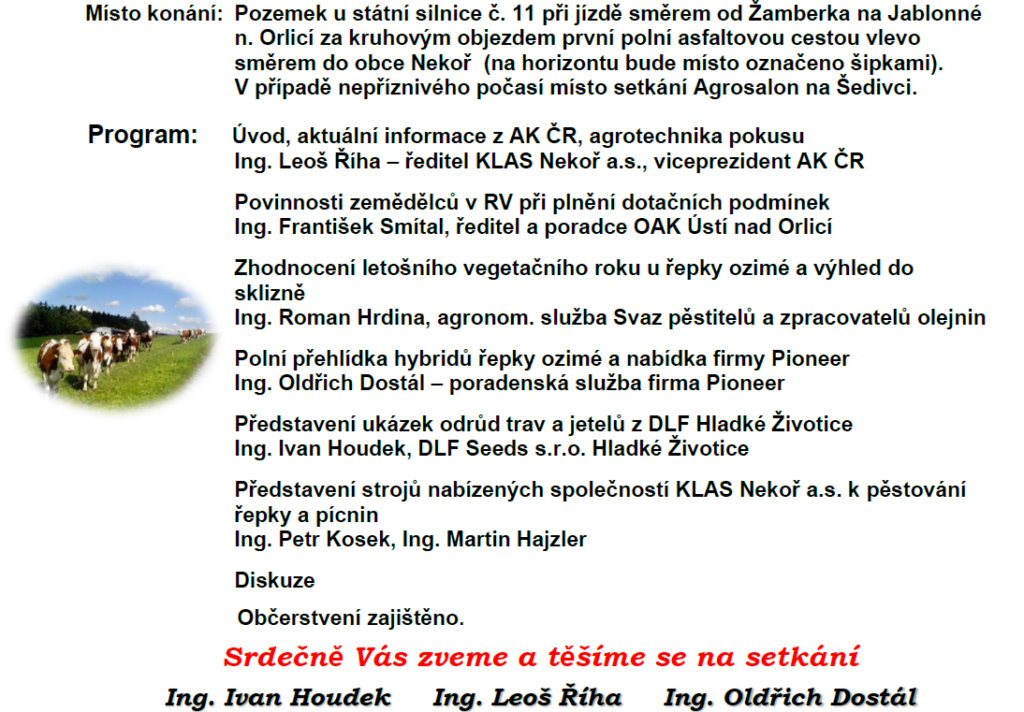 Vás zve na seminář a polní přehlídku špičkových hybridů řepky ozimé firmy Pioneer